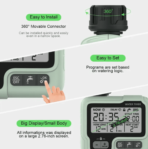 Con su programación sencilla y diseño funcional, este dispositivo combina tecnología y accesibilidad. Configure fácilmente los intervalos y horarios de riego, y deje que esta máquina inteligente se encargue del resto. Así, usted puede dedicar más tiempo a disfrutar de sus espacios verdes sin preocuparse por el mantenimiento del sistema de aspersión.