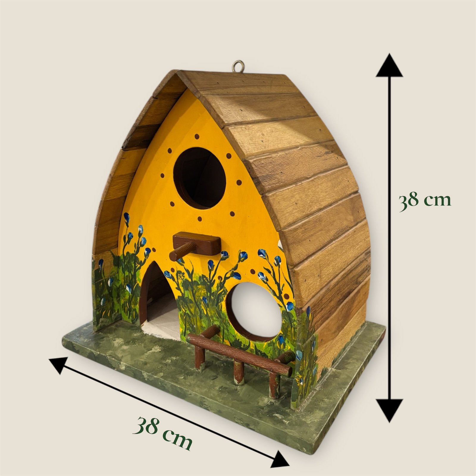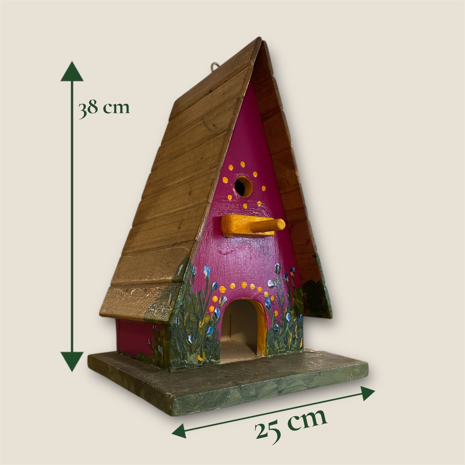 El diseño artesanal combina una construcción robusta con detalles pintados a mano que aportan un toque natural y decorativo. Con varias aberturas y un espacio interior cómodo, esta casita ofrece un refugio ideal para distintas especies de aves, a la vez que embellece cualquier jardín, terraza o patio.